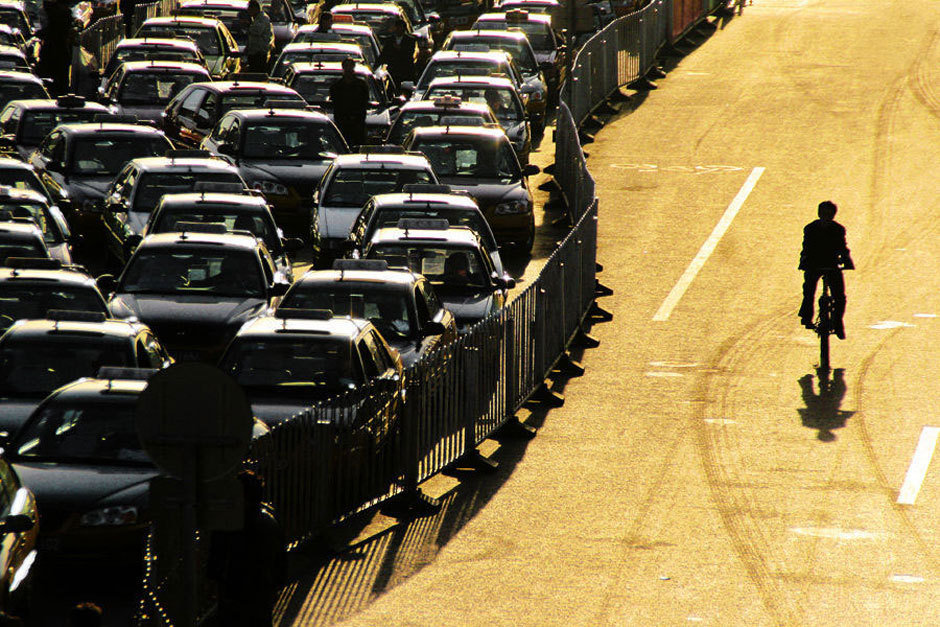 2007年4月3日,北京市东城区的北京站东街上,一位骑着自行车的行人从大量的出租车旁经过。