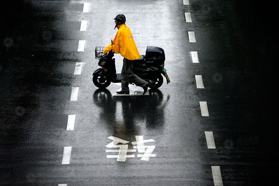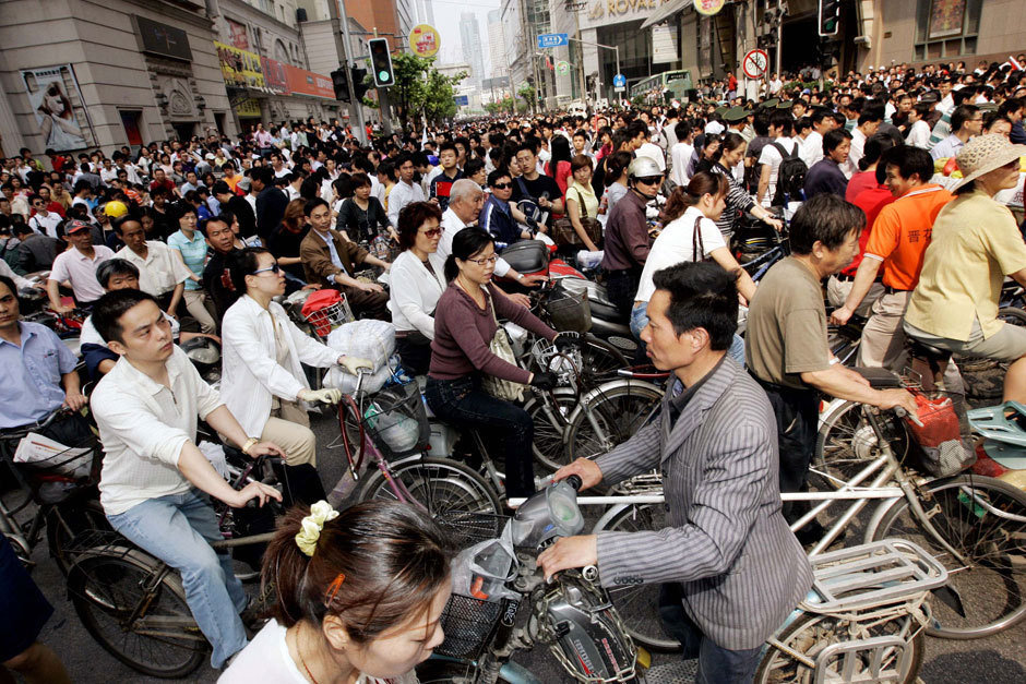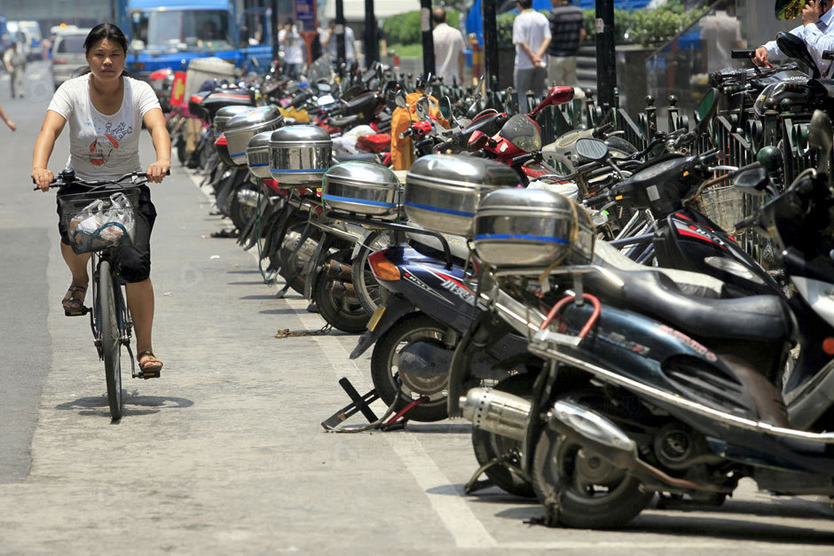 2009年6月,上海,一名男子正在推着电动自行车穿梭在马路上,在一份业内报告上显示,将近有65万辆电动自行车和摩托车在上海的马路上行驶。
