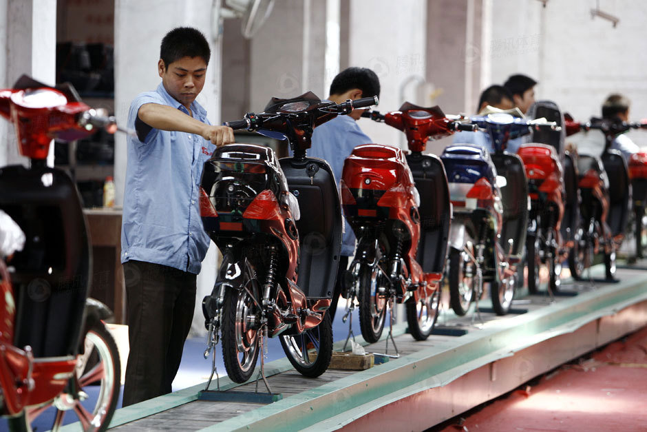 2009年7月,天津,工人们正在车间流水线组装电动自行车,电动自行车由锂电池驱动,政府规定速度在30公里每小时以内,但仍有热爱速度的人们在购买后自行改装,速度可提升至60公里每小时,对交通造成严重安全隐患。