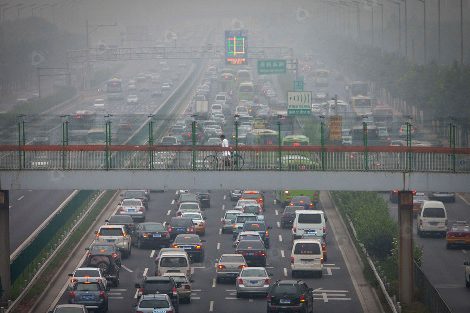 2010年7月30日,中国北京,早高峰,一名男子正在推着自行车通过过街天桥,当中国超过日本,快速成为世界第二大经济体时,随之而来的副作用显现,当发展成超大型城市、人口超过2000万,双向六车道公路随处可见时,自行车已经失去了它的利用价值。