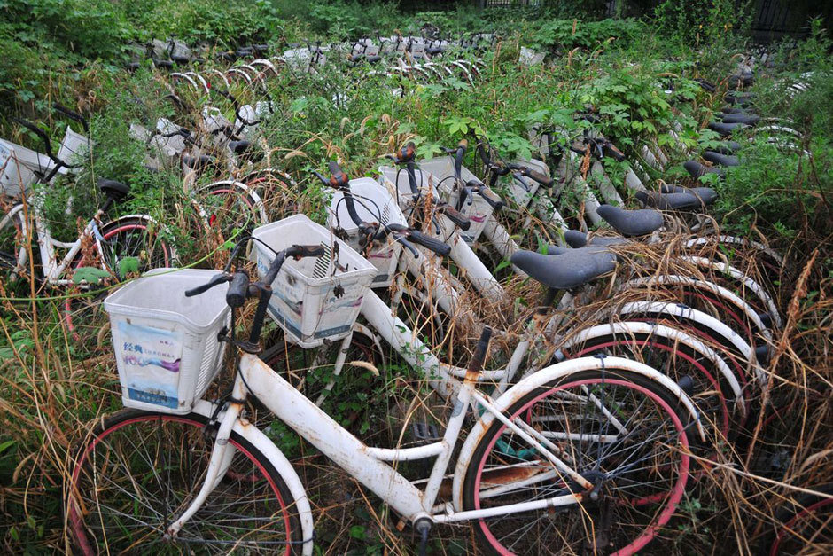2010年8月13日,北京望京地铁西站路边,成排的租赁自行车已被杂草所覆盖,北京市政府曾试图用这种方式缓解交通压力,但收效甚微。
