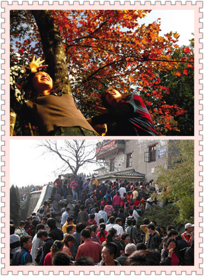 门头沟妙峰山 妙峰山也是每年都有红叶节。妙峰山赏叶是京西地区的一项传统活动,早在元朝初年就有京城百姓在秋日结队去观赏红叶的盛况。独特的地理环境和气候条件使这里的红叶似火,衬着金黄和翠绿。枫林、松林、杏林、黄栌等万叶斑斓,层林尽染,十分壮观。 10 月中旬,妙峰山的红果、山楂、盖柿将迚入成熟期。据景区管理人员介绍:深秋季节到妙峰山不仅可以赏红叶,还可以到有农家采摘园里采摘红果、山楂、柿子和购买一些农产品。在景区内可以购买妙峰山玫瑰干花、炒红果、独特风味的玫瑰酱、玫瑰黄芩茶、核桃等土特产品 海淀区百望山