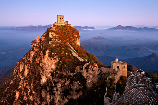 相比“香山红叶节”的拥挤嘈杂、人声鼎沸,上百望山赏红叶要安静、舒心得多。车辆也无需办通行证,驾车从清河小营环岛戒上地环岛径直西行几分钟内即可到达,也可以经颐和园从安河桥北行3公里到达。 百望山赏红叶最佳地点一处是友谊亭,此处林地开阔,坡缓路平,可漫步于红叶林中尽情享受。另一处是百望山顶峰的揽枫亭。登亭西眺太行群峰叠嶂,层林尽染,看漫山红叶苍松翠柏相映,红叶越发艳丽。这里当日落西山、晚霞红叶交相辉映时,看红叶感觉奇妙。从百望山沿石板路顺西山坡到深谷处有一“红叶仙子”石雕像,可环眺四周山峰。 司马台长城 司马台长城修建在燕山山脉的刃脊上,在最高点——建在海拔 986 米的老虎山顶峰的望京楼,东可以看到雾灵主峰,西可以看望到蟠龙山、卧虎山长城,南可看到密云水库。红叶满山时,山间的城墙如长虹般更加绚丽多彩。