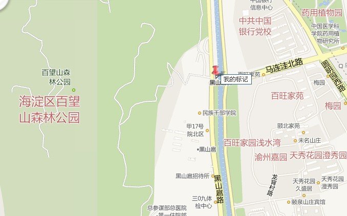 地点:黑山扈路马连洼路路口东北角,百望山森林公园门口对面,如下图。