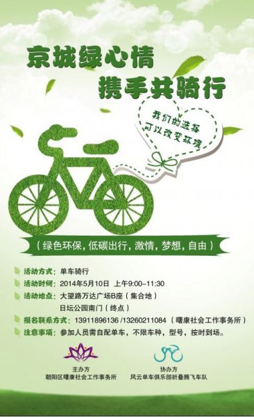 ◆ 活动背景:在这个繁华的大都市,当我们城市里汽车越来越多,道路越来越狭窄时,当白领们每天垂头工作,身心被繁重的工作压的喘不过气时,当空气污染,蓝天白云难以再见时-我们有理由思考,改变与宣传另一种出行方式。