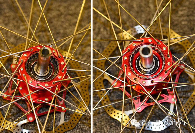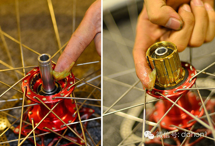 始终困扰着自行车零部件寿命与性能的问题就是水,以水做为介质可以夹杂着泥沙进入器材内部,特别是轴承位置。滚动的车轮最重要的核心就是花鼓,过多进入轴承内部的泥沙破坏轴承滚球表面的油膜造成磨损现象,不仅会出现阻力增大,而且还会严重损害轴承的整车使用。花鼓的常规保养就变得必须了,不仅仅可以提高使用寿命,更可以保持轮组的润度和较低的故障率。 目前市面上花鼓的种类大致分为两种,一种是培林型轴承花鼓,另一种是散珠型花鼓。培林花鼓应用十分广泛,纵向受力好,易拆易装易维护,培林可以更换等优点,但基于结构的问题防水性比较一般,基本防污机构只能够防止一些大颗粒沙子进入,却不能防水,所以培林花鼓的维护周期比较短。散珠型花鼓最著名的就是shimano生产,其靠着成熟的工艺,在市场上占有度也不少,而且耐用度高,shimano的看家本领就是迷宫式防水机构,雨水泥沙之类的很难进入轴承内部,防水性十分的好,故障率也比较低,维护周期长等特点。 一般除顶级shimano花鼓外,其他型号都是钢制塔基 日常维护比较简单,只需卸下飞轮用棉布除掉堆积在塔基附近的泥沙即可。散珠花鼓一般不建议车友自行拆卸,因为是角接触轴承的关系,轴承之间的间隙很难调整到原来的状态,而且极具风险,过紧的话容易出现磨损磨出坑道,过松容易受到晃动撞击,在滚球表面形成麻点或者滚球碎裂的情况,如果需要拆卸保养的车友建议到专业的自行车维修店进行保养。 清洁过后在塔基表面涂上适量的润滑脂即可 培林型轴承的维护就简单许多,没有什么大的忌讳,拆卸、清洁、加油就可以完成保养,轴承坏了直接换掉就可以了。 不同的品牌都有不同的结构,但结构原理大致雷同,这次就用培林型花鼓代表“Hope”来演示一下保养要领。 只需卸下塔基侧的顶盖就能拆下塔基总成,经历过几场雨水骑行终究是要保养的,里面的润滑脂已经发黑,用手摸一摸还能摸到比较细腻的泥沙,这时保养的重要信号,过多的泥沙堆积会影响塔基内千斤片与逆棘器的要和状态,严重的情况还会将千金片顶碎! 花鼓内的逆棘器部分也要清理干净 清理完毕后不要忘记在逆棘器上涂抹适量的润滑脂作为润滑,铝合金塔基表面也要涂上一些润滑脂,防止飞轮与塔基“咬死”的情况,之后就按照拆卸的顺序安装回去就保养完毕了。
