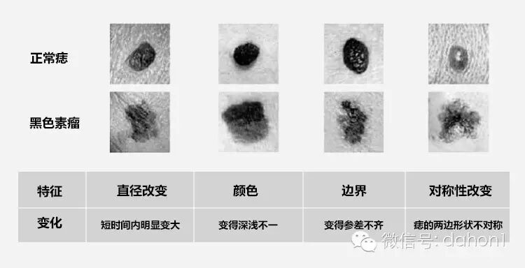 如何自查 美国国家癌症研究所有一个可以区分痣点和黑色素瘤的办法,以字母A-E为判别索引: A: Asymmetrical shape (形状不对称) B: Border is irregular (边缘不规则) C: Color is uneven (颜色不均匀) D: Diameter is usually ¼" or larger (直径通常为5-6mm或更大) E: Evolving size, shape, or color(大小、形状或颜色会改变) 知道危险区 黑色素瘤通常会出现在颈部,耳朵后边等经常面对太阳曝晒的区域,当你骑上自行车,刚好是后背的部分接收阳光。这也是为什么Neben的黑色素瘤会出现在背部。
