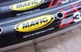 无论是黄色的商标还是右侧红色的“X”花纹,色彩都极为暗淡,正品的相对就很鲜明,正品的MAVIC317车圈均是台产,只有MAVIC 717 这样等级稍高一些的车圈才有法国原产的。而假冒的MAVIC 317 V刹车圈上面却堂而皇之的写着“Made In France”?