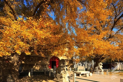 松、柏、银杏是大觉寺内主要的树种,尤以中路栽种居多。秋天万物已经开始凋零,但大觉寺里却展开了另一幅绝美的画卷。无量寿殿前的银杏树,迎来了它的璀璨时节。现在正是银杏树一年中最美的时节,大觉寺千年的银杏树以及“九子抱母”银杏树都将展露最美丽的身姿,树叶如彩蝶由绿转黄而后飘落,那将是怎样的美丽与壮观?还是身临其境地来亲自感受吧。