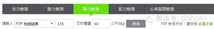 对骑力有兴趣的朋友,可以直接进入“能力检测”页面中操作:直接在“FTP检测结果”中输你近期的“临界功率”与“体重”,再按“检测”,下方就会出现你的骑力值和各级训练功率。