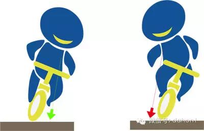 拉动刹车时,由你心脏-头的这条线会向前移-就像一根绑着纺锤的绳子。如果这条线投射到地面的点超过前轮的接地点,你的身体会被向前拉引接着发射出去。用力刹车就好比撞上一颗大石头-刹车力道太大会导致你的重心被向前抛,越过你能保持平衡的临界点。刹车跟撞击障碍物是相同的,你的重心必须保持在前轮接地点的后方