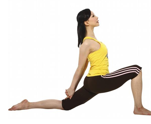 弓箭步:穿锁鞋做这个动作要特别注意,因为卡鞋比较滑、容易跌倒,双脚一前一后打开约1公尺左右,膝盖要保持在同一直线上,不要外开或是内缩。 这个动作可以伸展到大腿的股四头肌以及小腿的部分肌群,记得做完其中一边之后要换边。