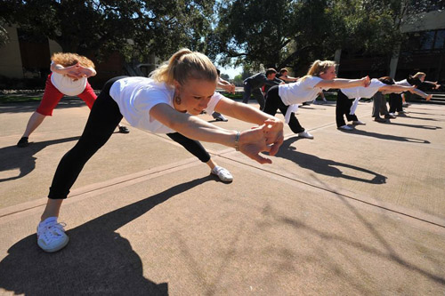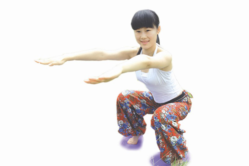 压肩:做这个动作的时候,避免腰背部拱起,这样就无法达到伸展的功能。压肩的动作可以同时伸展颈部、背部、下腰部以及大腿后侧的肌群。