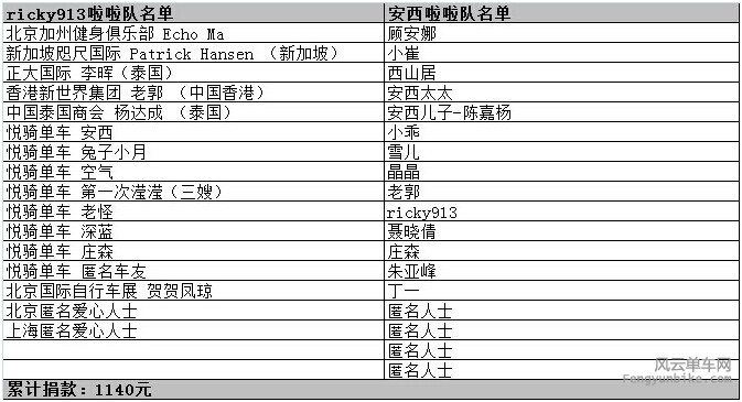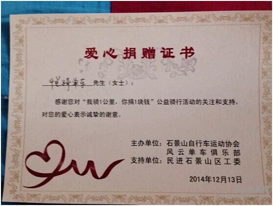 石景山老山西里,有这样一所学校,相对北京各大重点学区,可能他并不起眼,但是在这所学校里,容纳了一百多名残疾孩子,这些小天使,以智力障碍、自闭症、脑瘫、多重残疾为主。为了让残疾的孩子们能顺利接受教育,成功融入社会,石景山培智中心学校一直在默默的努力。 12月13日,悦骑单车俱乐部携手兄弟车友会,在风云单车的组织下,参与并支持“我骑1公里,你捐1块钱”公益骑行活动。 人生而平等,无论你是社会精英,还是草根一族,都不妨碍我们共同携手,为公益而行。 本次活动中,悦骑单车俱乐部组建了两只啦啦队,由俱乐部创始人ricky913和安西分别担任挑战者。913啦啦队18人,安西啦啦队20人,共计捐赠1140元。已经顺利转交活动主办方,由主办方交给受捐对象: 石景山培智中心学校. 在此感谢悦骑单车俱乐部队员对本次活动的大力支持与爱心捐助,以及社会上的爱心人士,本次悦骑单车爱心捐助还有来自泰国新加坡中国香港地区的海外朋友以及在上海的车友发来捐助款!让我们在这个寒冷的冬季感受到务必温暖!捐赠爱心者名单如下: