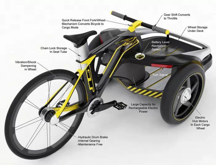 但是简单的几个步骤,这辆车就可以变成一辆电动小货车。附加的载货模块的两个轮子是自带动力驱动的,并且集成了照明系统与转向指示灯,由于前叉与前轮的移除,载货的空间非常可观。并且GT公司希望未来这辆车可以在两种模式下自动转换。