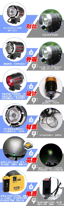 开团开团~ 冬天的时候积蓄能量~ 为开春骑行做准备 这次团灯 前灯和尾灯 说说前灯 蓝野N95 这次团购155元 之前自己用过一个snailkey和这个差不多的 200多块 照明效果和持续时间都不错 只不过时间长了用得不精心 把线拽断了 挺心疼 这次碰到蓝野 价格很实惠 发上来大家一起分享好东西~ 太专业的我是真不懂 装备控可以根据参数判断哈~ 我有个灯主要是为了骑车照亮儿的 感觉比手电亮 时间也长 不影响折车挺方便 性价比不错 我们第一批团的已经到货 后边会放上实物装车图片还有开灯的效果图 说实话 比想象中的做工要精细 因为之前也卖过100出头的灯 对比很鲜明 而且这款很重要的一个特点是 可以支持USB的输入输出 也就是说可以用灯的电源给手机充电(不过我个人不建议,毕竟手机老贵了,万一呢哈~) 同时也可以用手机移动电源给灯供电 这就意味着车灯可以使用更长时间了~ 跑长途和夜路的朋友们真的可以进一只~ 需要的朋友可以把银子转到我支付宝 cyndi_jas@sina.com *微 也可以工行转账拍淘宝 可以直接联系我 马化腾461⑧二9五6 一般下单后3天到货 我会联系您 崇文门、阜成门可自取 如果需要发快递的话也可以 只不过运费您得自理 北京6块