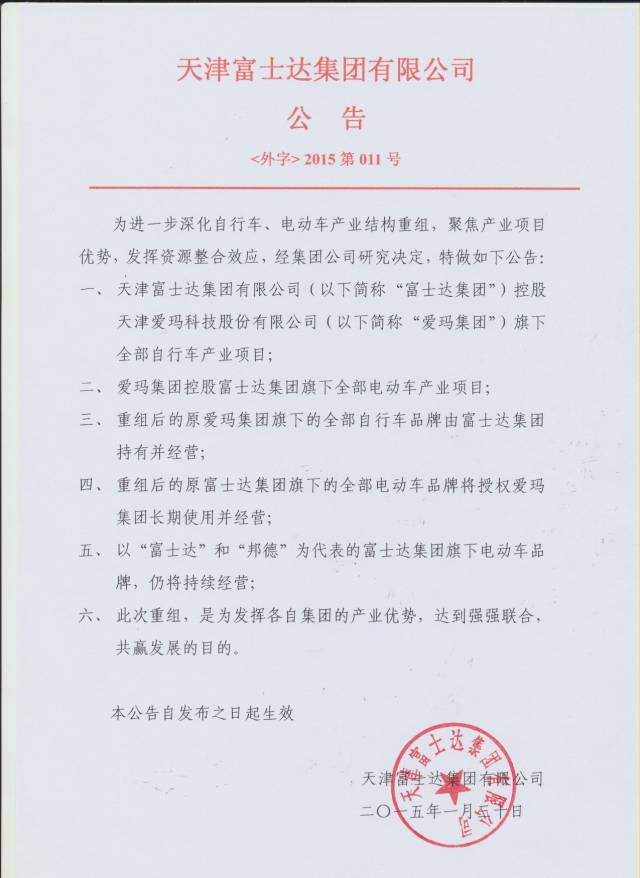 行业重大状态 : 天津富士达集团有限公司声明 |