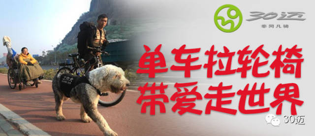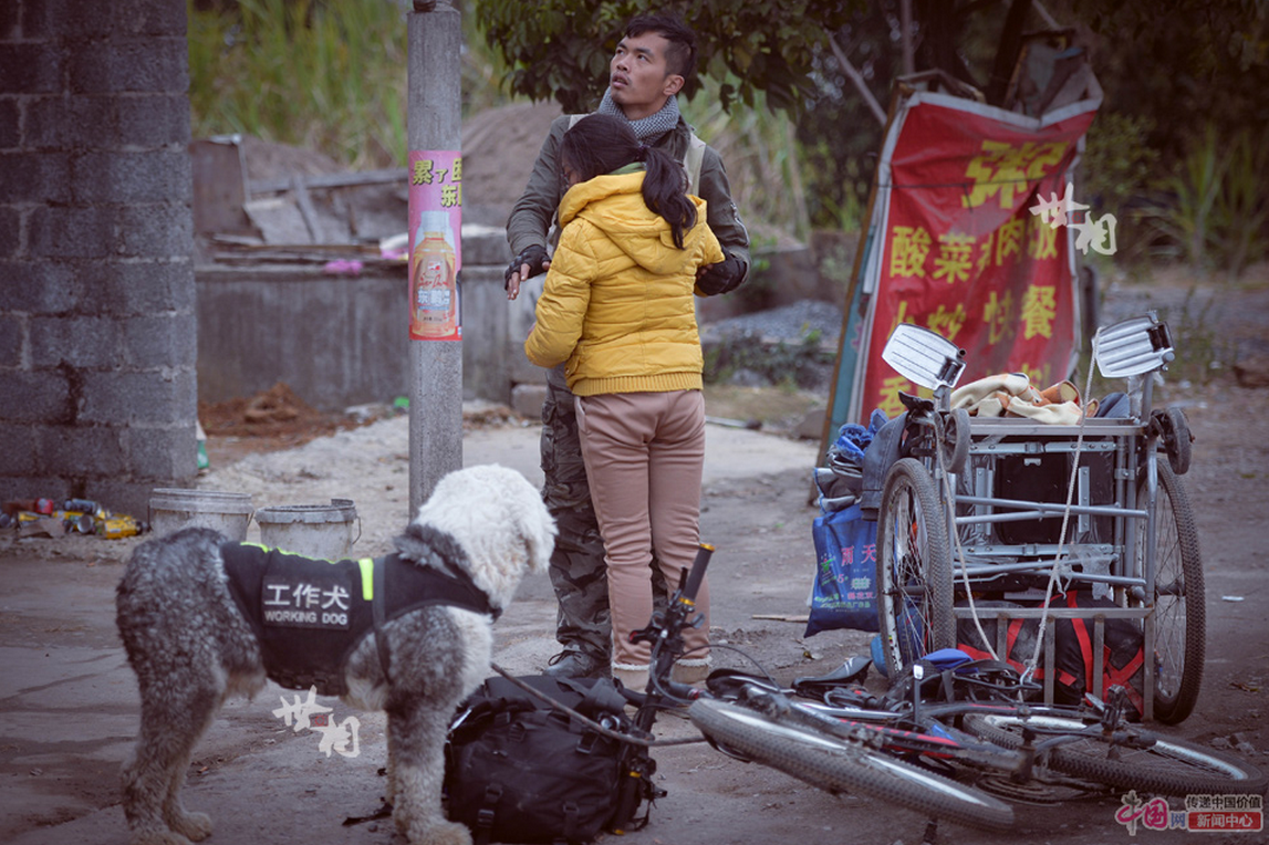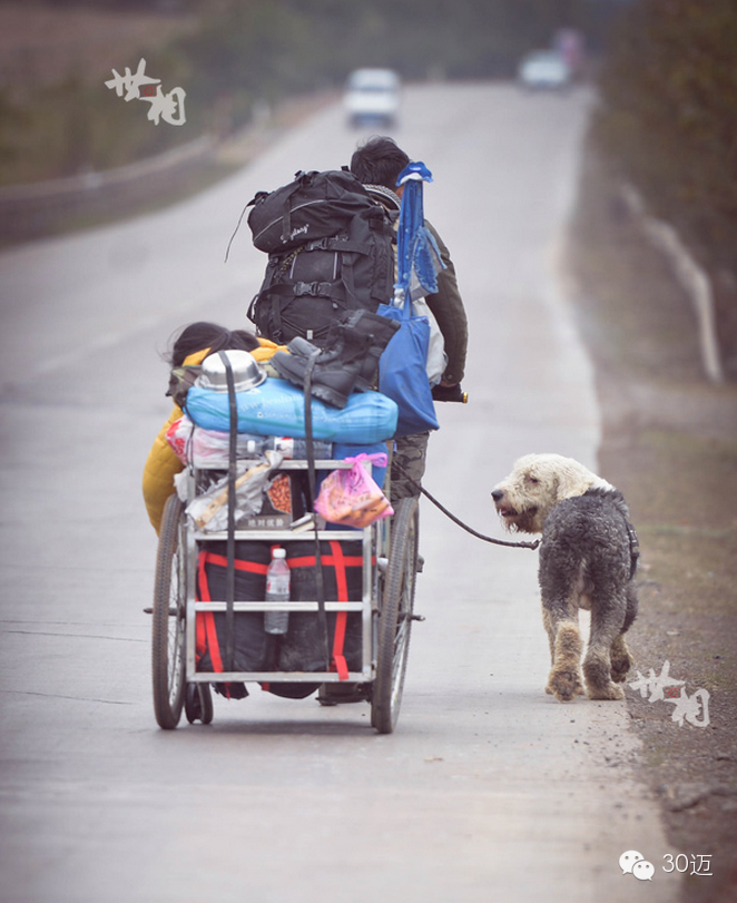 排头是一只叫“阿宝”的犬,小伙丁一舟骑着单车在中间,“阿宝”和单车上都拴着一根绳子,拉着走在最后的一辆轮椅,患有“企鹅病”的赖敏就坐在这个轮椅上面。