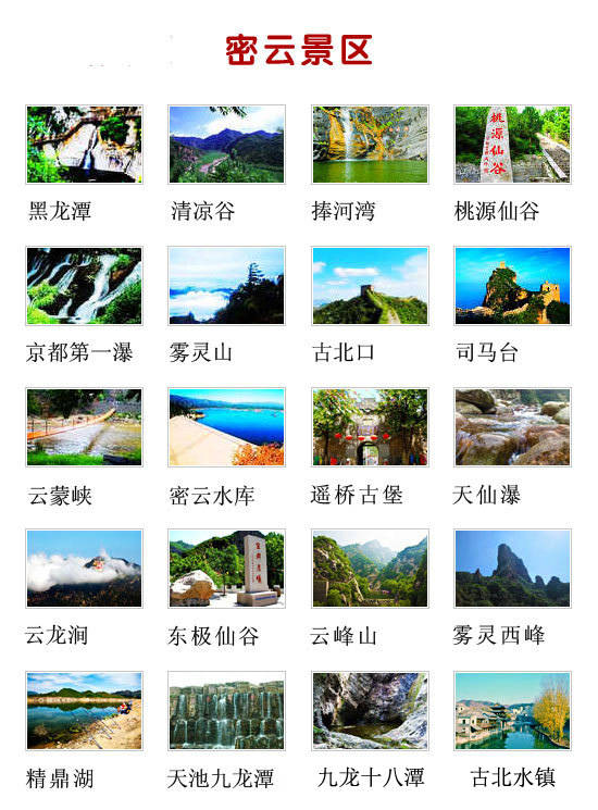 密云县旅游资源丰富,旅游环境得天独厚。美丽的密云水库宛若明珠镶嵌于华北平原上,环抱于燕山山脉之中。全县森林覆盖率超过60%,水体质量达到国家二级标准,空气质量达到国家二级标准,绝大部分地区大气质量达到国家一级标准,这三项指标居北京市各区县之首,可以说密云县已成为净水、净土、净气,无公害的绿色乐园。密云县山秀水清,旅游资源极为丰富,全县具备可开发价值的旅游资源达100多处,被誉为"北京山水大观,首都郊野公园"。 延庆是北京的一个县,地处北京市西北部,三面环山一面临水,生态环境优良,是首都西北重要的生态屏障。境内海坨山是北京市第二高峰,“海坨戴雪”成为北京的一大奇观。气候独特,冬冷夏凉,有着北京“夏都”之美誉。