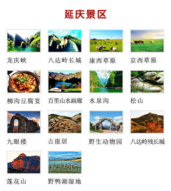 延庆旅游资源丰富,特色鲜明,是京郊旅游大县。对外开放的景区景点30余处,其中A级以上景区16家,包括举世闻名的八达岭长城,塞外小漓江龙庆峡,广袤辽阔的康西草原,国家自然保护区松山森林公园,千古之谜古崖居,国家级湿地保护区野鸭湖等景区、景点。