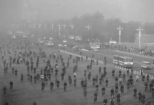 1981年,北京市民上班或出行主要靠自行车,着装也几乎是蓝黑灰色。