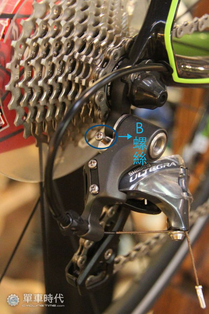 调整导轮与齿轮间的距离,即是B螺丝的工作。当你锁紧B螺丝,你会发现整个后变将往后移动;相对的放松之际,链条会较为接近飞轮,「愈靠近飞轮则变速反应愈灵敏。」话锋一转,目前台湾已存在某个现象,为了轻松挑战爬坡,后方飞轮愈来愈大,直逼前方大盘,打到扭力端就必须离远一点(放松B螺丝),相对稍微牺牲了换档反应效率。