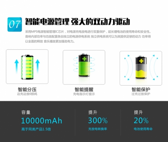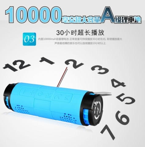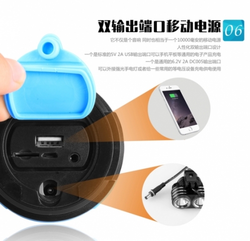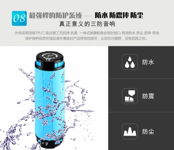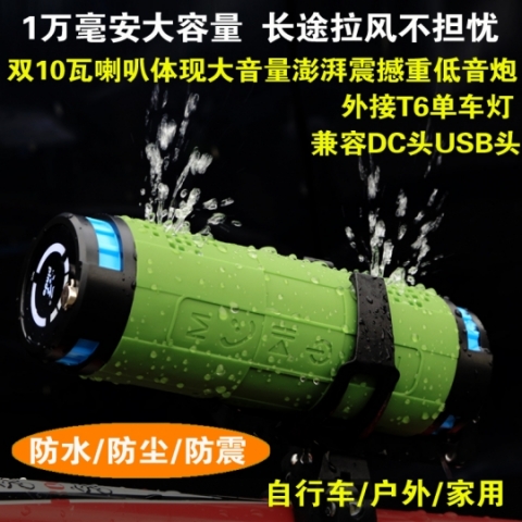 功能:防水+防尘+防震。两个10瓦大功率内磁喇叭+低音反射+蓝牙EDR4.0+插卡+内置收音机增强天线+内置声卡+切换文件夹+单曲循环+1万毫安锂电池+移动电源+T6灯外接口