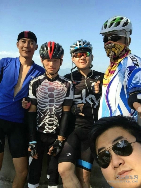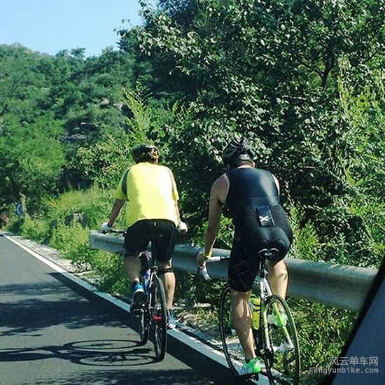 爬至一半,ALISA美女也略感体力不支,我怕出危险,也安排上了后援车。就剩我和王岩同学在队伍后边了,此时我体能恢复了不少,但王爷一直在队伍后边负责收队,体能上显得稍有力不从心;我心生善念陪着他骑吧,一直聊天打岔,给他加油鼓劲,当拐过最后一个弯道看到坡顶集合的队伍时,王爷不知哪来的体能,犹如脱缰野马弃我而去,摇车冲上坡顶,大喊一句我不是最后一个!!!顿感人心隔肚皮,咱哥们平时那一泡尿的交情哪去了???腹黑到如此境界,可见一般。。。。。。