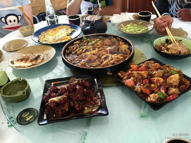 可终归午饭的诱惑力更大些,还是继续吧。过不多时,负责后援车的宁丰同学告知后边新一同学扎胎了,商量后决定让前边的兄弟们寻找饭馆,他负责下去接人直接去饭馆。在这里特别感谢牛虎和马克,为大家找了一个好饭馆;更要特别感谢宁丰同学细致入微的后援服务。 大家相互鼓劲,挪到饭馆,一进门没别的,一人先来瓶冰镇北冰洋!!!;两口下肚,瞬间舒服了不少。等到人齐了,开动碗筷,你看那一个个的,保证不说话,全都闷头往嘴里呼噜。一点不夸张的说,最多20分钟,桌上空了,吃的各个是挺着肚子,填了个沟满槽平。。。。。。。。。 吃完饭也就在13:30多点,但那时太阳正毒,于是大家商量最早2:30出发,等太阳不算太强时再爬慈悲峪。利用这一个小时左右的时间,大家坐在饭馆外的廊子下有的是聊天打岔;有的是“横尸”椅上;有的忙着换上备胎。修养时间很快就过去了,2点半从水池里掏出事先冰镇好的西瓜集体“洗脸”,吃罢合影留念,准备爬坡。考虑安全问题,安排风信子同学上后援车,萌萌也是因怕引起旧伤,一并上车。