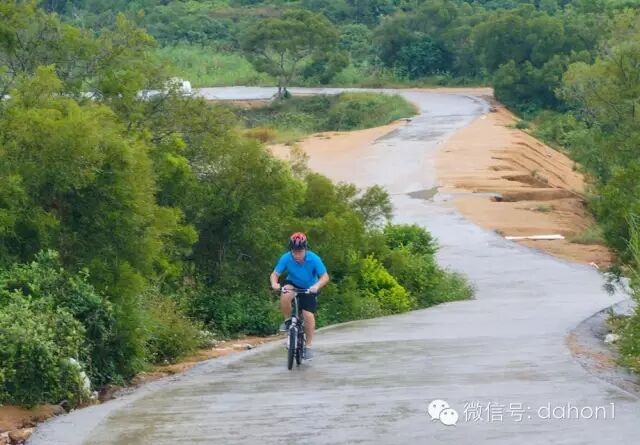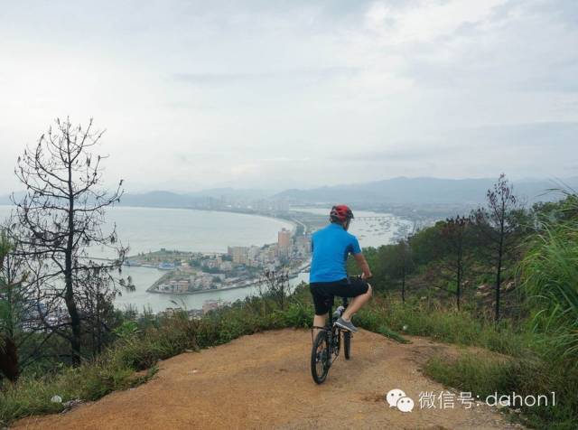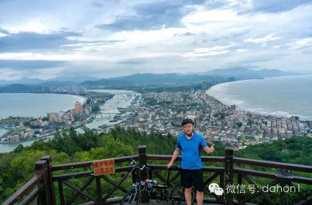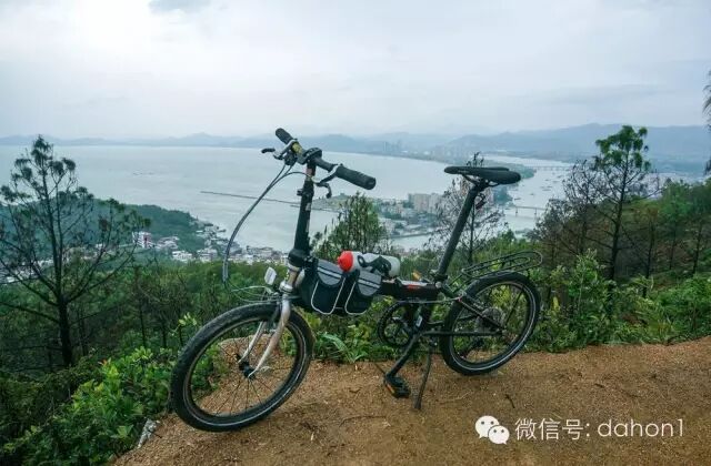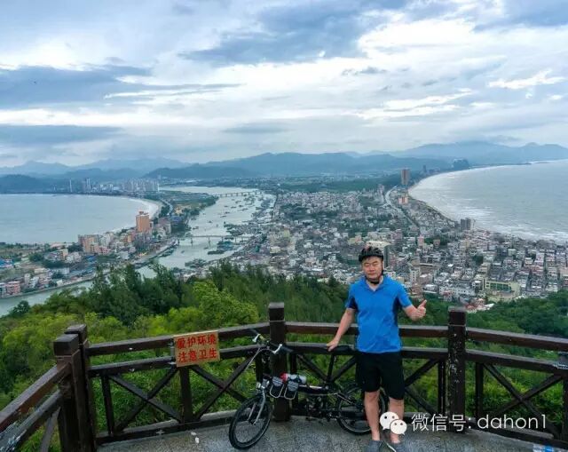 本来计划在双月湾露营看日出,但天气不太好,海上雾大。到达港口镇后,从车上取下大行D9,整理好装备,开始向大星山顶上的观景台骑行。海拔二百多米,利用D9的低档位,爬坡骑行了不到半个小时轻松的登上山顶,观赏了双月湾的全貌。虽然没有看到蓝天白云、碧海晴空,但是壮丽的景色令人眼前一亮,港口镇夹在两个半月形海湾中间,在这里鸟瞰像两轮新月。双月湾左湾波涛汹涌,右湾水平如镜, 一望无际的沙滩,雄奇壮观,洁白的半月形沙滩,沙质幼细,晶莹洁净,真是太漂亮了。感慨大自然的神奇造化,造就了如此壮观的景色,令人叹为观止!