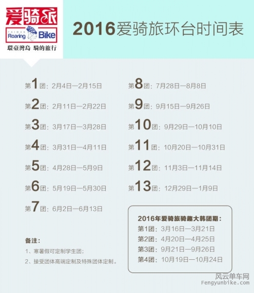 厦门—基隆—台北—台中—埔里—日月潭—嘉义—高雄—垦丁—知本—瑞穗—宜兰—基隆—厦门 说明:厦门集合,坐客轮到台北港,开始逆时针环岛骑行,往返12天。